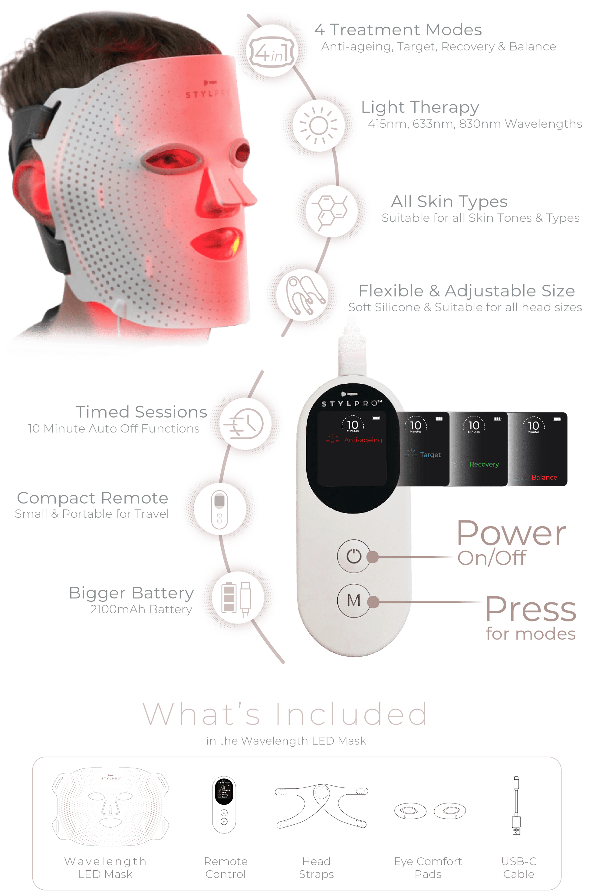 Reveal a fresh, youthful-looking glow with the STYLPRO Wavelength LED Face Mask. Featuring 360 LEDs and four cosmetic skincare modes, this wearable mask uses red, blue, and near-infrared light to support a brighter, clearer, more radiant complexion. Red LED light helps reduce the appearance of fine lines and wrinkles, blue light helps skin look clearer, and NIR provides a calming, comforted feel — while the Tri-Light mode brings all three together for multi-benefit care.