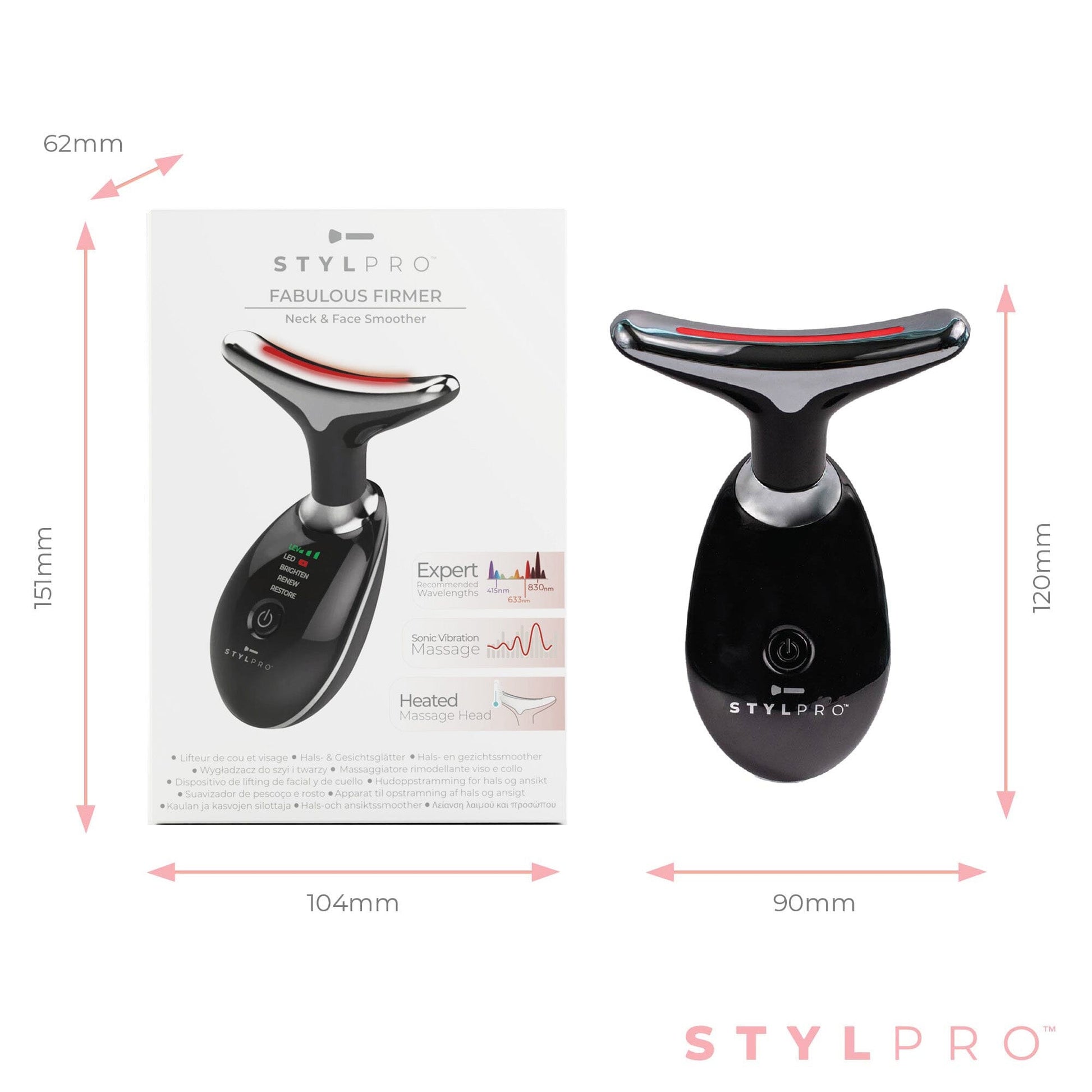 Helps to reduce the appearance of wrinkles, age spots, and uneven-looking skin, the STYLPRO™ Fabulous Firmer Neck & Face Smoother uses a combination of heat, vibrations, and LED light technology to help skin look firmer and more elastic, helping pores look tighter and help skin look clearer. Say goodbye to costly spa visits and say hello to unlimited facials from the comfort of your own couch with this must-have LED light device. Take control of your skincare journey and experience the benefits of pro-inspired sessions in the convenience of your own home. Cosmetic device. Not intended to diagnose, treat, cure, or prevent any disease.